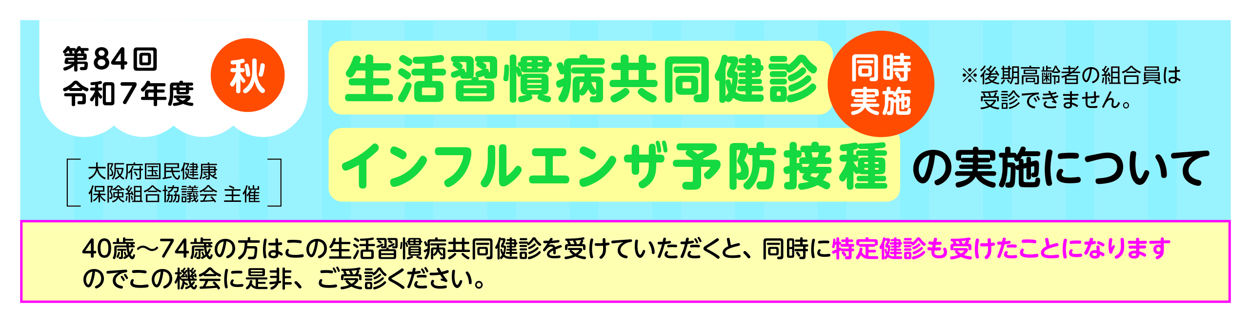 ※ | 既に令和7年度春(5/19~8/31実施分)の生活習慣病共同健診を受けられた方は、今回は受けられません。インフルエンザ予防接種のみ接種可能です。 |